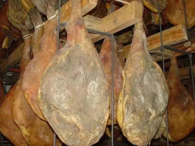 接下來把一切交給時間。10天后從鍋中取出豬腿適量撒鹽并翻面。繼續(xù)腌制10天后將豬腿取出洗凈晾干,掛在屋內(nèi)通風(fēng)良好的地方腌制超過8個月后,一支風(fēng)味獨(dú)特的宣威火腿便腌制完成了。腌制成熟的火腿有如身披綠袍,表面發(fā)綠,內(nèi)里鮮香。