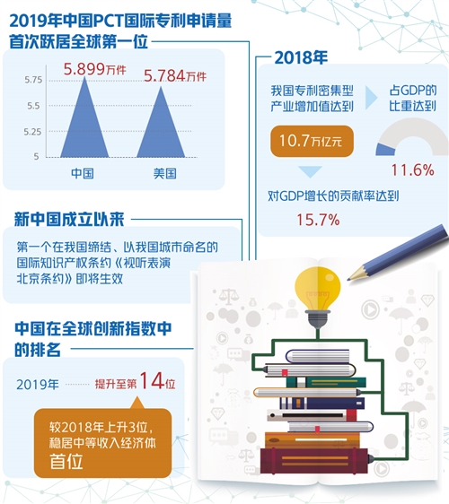 4月20日至26日是全國知識產(chǎn)權(quán)宣傳周。在4月23日舉行的國新辦新聞發(fā)布會上,國家知識產(chǎn)權(quán)局局長申長雨透露了我國知識產(chǎn)權(quán)事業(yè)取得的顯著成績——2019年中國PCT國際專利申請量首次躍居全球第一位;新中國成立以來第一個在我國締結(jié)、以我國城市命名的國際知識產(chǎn)權(quán)條約《視聽表演北京條約》即將生效;中國在2019年全球創(chuàng)新指數(shù)中的排名提升至第14位,較2018年上升3位,穩(wěn)居中等收入經(jīng)濟(jì)體首位。