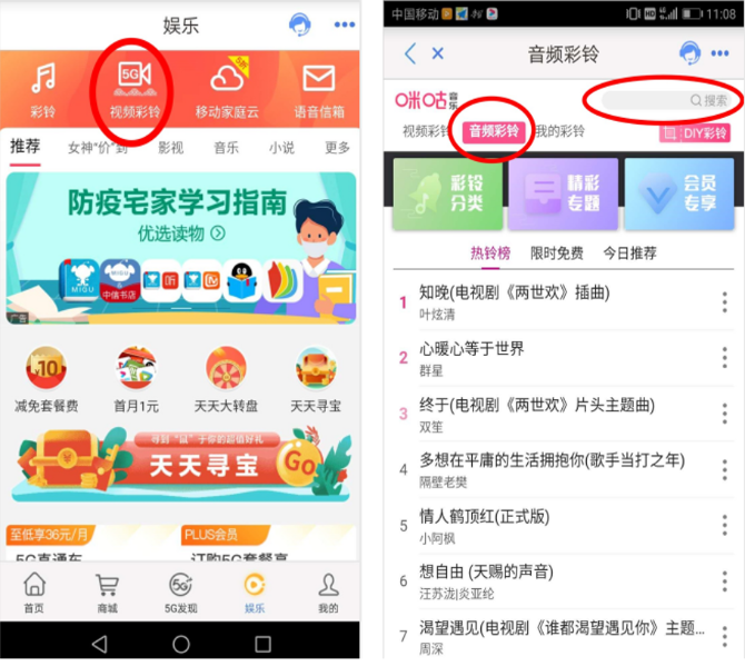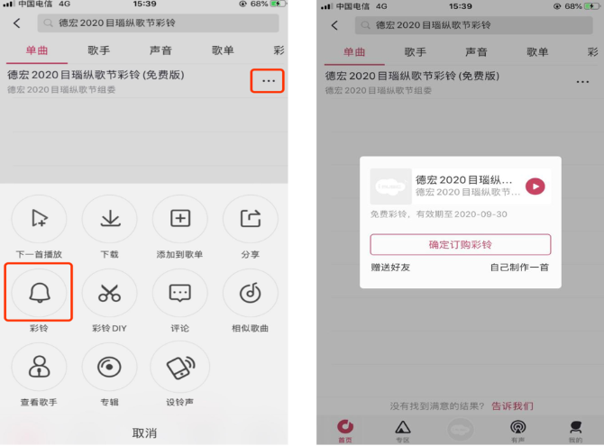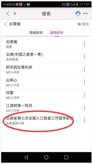 第三步:在搜索看輸入“云南省第七次全國人口普查主題彩鈴”進(jìn)行搜索。點擊右側(cè)“…”提示符,在彈出的選項中選擇“彩鈴”,再點擊“確定訂購彩鈴”即可設(shè)置為手機鈴音。