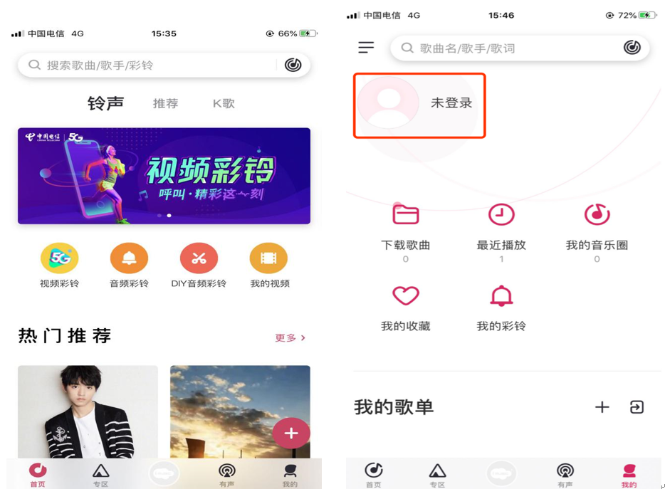第二步:使用需要設(shè)置彩鈴的號碼登陸“愛音樂”客戶端首頁,點擊右下角“我的”,再點擊左上角“登陸”。