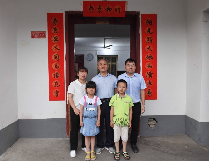 江西于都縣梓山鎮(zhèn)潭頭村烈士后代孫觀發(fā)和家人在家門前合影(2019年5月20日攝)。新華社記者 周密 攝