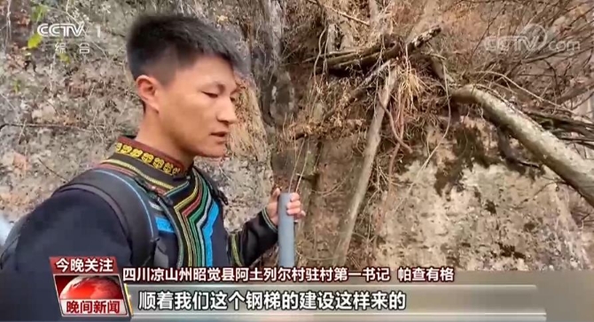 四川涼山阿土列爾村駐村第一書(shū)記 帕查有格:現(xiàn)在你看這個(gè)線是一個(gè)光纜線。這些線路的鋪設(shè)就是順著我們這個(gè)鋼梯的建設(shè)這樣來(lái)的。隨著路修通了以后,電、網(wǎng)絡(luò)等等一系列也實(shí)現(xiàn)全通了。