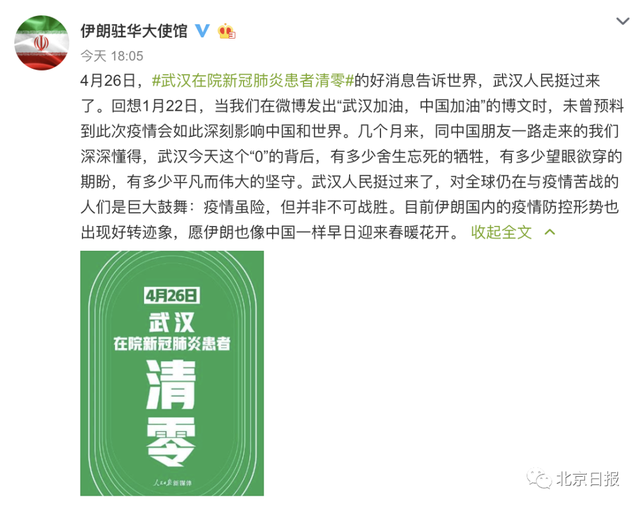 備受鼓舞的,還有伊朗人。26日18時許,@伊朗駐華大使館 發(fā)微博稱,武漢人民挺過來了,對全球仍在與疫情苦戰(zhàn)的人們是巨大鼓舞:疫情雖險,但并非不可戰(zhàn)勝。