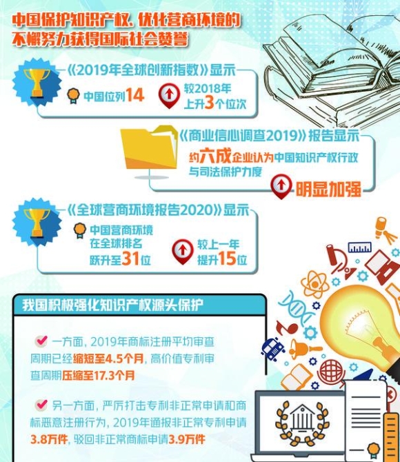 世界銀行發(fā)布《全球營商環(huán)境報(bào)告2020》顯示,中國營商環(huán)境在全球排名躍升至31位,較上一年提升15位。在營造良好營商環(huán)境中,知識(shí)產(chǎn)權(quán)保護(hù)發(fā)揮了重要的作用。
