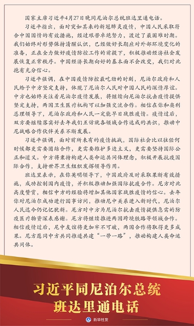 新華社北京4月27日電 國(guó)家主席習(xí)近平27日晚同尼泊爾總統(tǒng)班達(dá)里通電話。