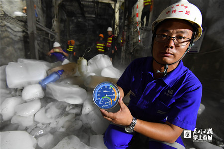 除了“水深”,還有“火熱”。隧道內(nèi)高地溫段長期溫度達40℃左右、濕度85%以上,施工單位長年往隧道施工挖掘面運送冰塊降溫,施工人員每3小時換一次,每天每個挖掘面需要12噸冰塊。