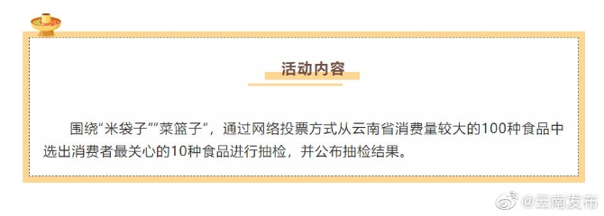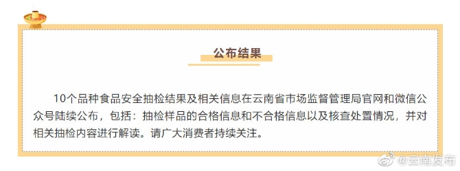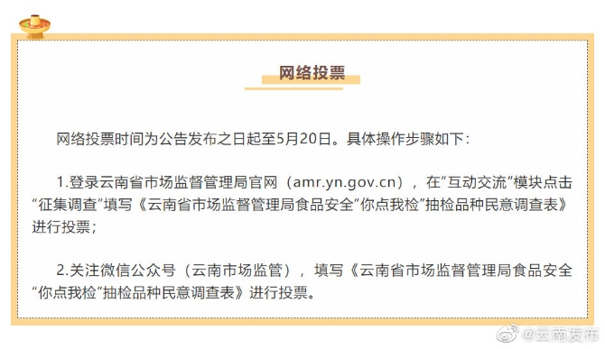 昆明信息港訊 機器人小明 【云南人注意!食品安全抽檢民意調(diào)查開始,要抽哪些你說了算】近日,云南省市場監(jiān)督管理局決定于4月28日至5月20日,在全省范圍內(nèi)開展食品安全“你點我檢”活動。將從云南消費量較大的糧食加工品、調(diào)味品、肉制品等21類100種食品中選出消費者最關(guān)心的10種食品進行抽檢。如何參與調(diào)查?戳下圖查看↓↓↓(云南省市場監(jiān)督管理局)