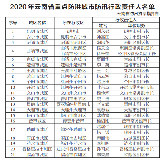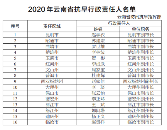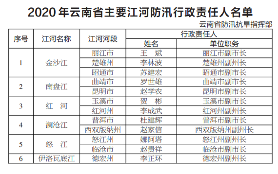 4月29日,為貫徹落實(shí)防汛抗洪、抗旱工作責(zé)任制度,切實(shí)做好2020年度防汛抗洪減災(zāi)工作的組織協(xié)調(diào),保障2020年抗旱救災(zāi)、抗洪搶險(xiǎn),以及全省重要設(shè)施安全度汛等相關(guān)工作高效、有序進(jìn)行,云南省防汛抗洪指揮部對(duì)外公布了2020年云南省防汛抗旱行政責(zé)任人名單向社會(huì)公布,并接受社會(huì)各界的監(jiān)督。