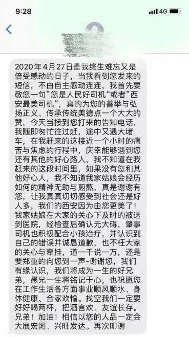 2020年4月27日是我終生難忘又倍受感動的日子,當我看到您發(fā)來的短信,不由自主感動連連,我首先要敬您一句“您是人民好司機”或者“西安最美司機”,真的為您的善舉與弘揚正義、傳承傳統(tǒng)美德點一個大大的贊!