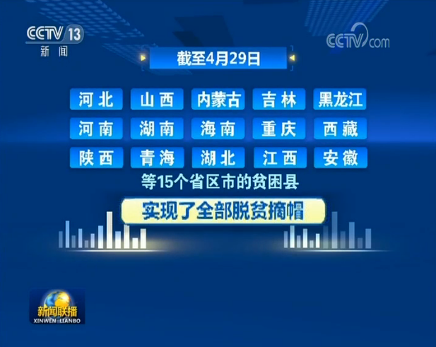 截至4月29日,我國(guó)已有河北、山西、內(nèi)蒙古、吉林、黑龍江、河南、湖南、海南、重慶、西藏、陜西、青海、湖北、江西、安徽等15個(gè)省區(qū)市的貧困縣實(shí)現(xiàn)了全部脫貧摘帽。(央視網(wǎng))