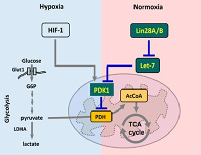 科研人員通過前期的研究發(fā)現(xiàn),在低氧條件下,低氧誘導(dǎo)因子HIF-1轉(zhuǎn)錄調(diào)控代謝酶PDK1抑制三羧酸循環(huán),部分解釋了腫瘤細胞中糖酵解增強的機制。但這并不能解釋為什么腫瘤細胞在氧氣充足的條件下傾向于利用低效的糖酵解方式這一現(xiàn)象。研究人員以此為切入點展開進一步研究,發(fā)現(xiàn)在常氧條件下,腫瘤細胞通過異常表達的Lin28/let-7調(diào)節(jié)軸轉(zhuǎn)錄后調(diào)控代謝酶PDK1,對腫瘤代謝進行重編程,從而促進糖酵解的發(fā)生。