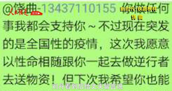 妻子劉丹特別擔(dān)心饒曲的安全?!叭f一我‘中標(biāo)’,請(qǐng)照顧好我的家人。”一天,劉丹看見饒曲在公益群里的留言,不禁淚流滿面。她動(dòng)情地回復(fù)道:“你做任何事我都會(huì)支持你……這次我愿意以生命相隨,跟你一起去做‘逆行者’,去送物資……”從那以后,劉丹下定決心陪著丈夫一起送物資,照顧他的安全。