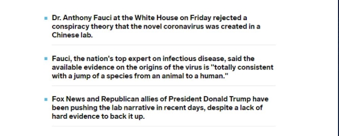 文章說,盡管缺乏確鑿證據(jù),特朗普及其盟友一直在鼓吹新冠病毒由實(shí)驗(yàn)室制造的觀點(diǎn)。對(duì)此,福奇表示,現(xiàn)有證據(jù)顯示病毒的起源“完全符合”從某種動(dòng)物傳染到人類的特征。