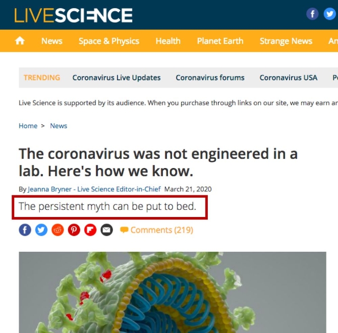 美國科學(xué)新聞網(wǎng)站Live Sceince刊登的一則科普?qǐng)?bào)道指出,虛假信息的傳播速度絲毫不亞于新冠病毒。文章援引多位權(quán)威專家研究成果,詳細(xì)闡釋為何新冠病毒不可能由實(shí)驗(yàn)室制造。作者感慨:“這個(gè)固執(zhí)的荒誕說法當(dāng)休矣!”