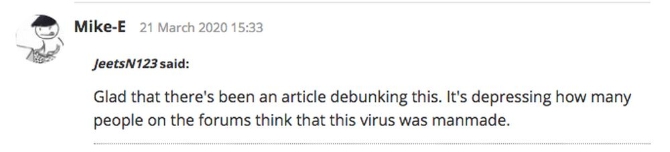 網(wǎng)友Mike-E跟帖說,很高興看到這篇辟謠文章,論壇里那么多人都認(rèn)為病毒是人造的,真讓人沮喪。