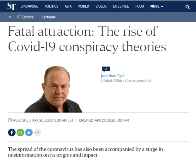 新加坡《海峽時(shí)報(bào)》網(wǎng)站刊登文章《致命誘惑:新冠病毒陰謀論的興起》指出,伴隨新冠病毒的蔓延,關(guān)于病毒起源及疫情影響的假信息正在泛濫。正如其他所有陰謀論一樣,所謂“病毒泄漏”論毫無道理。但令人無奈的是,陰謀總是比乏味的現(xiàn)實(shí)更有吸引力。