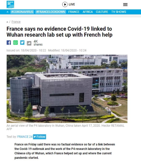 法國24電視臺(tái):《沒有證據(jù)顯示新冠疫情與武漢病毒所相關(guān)》