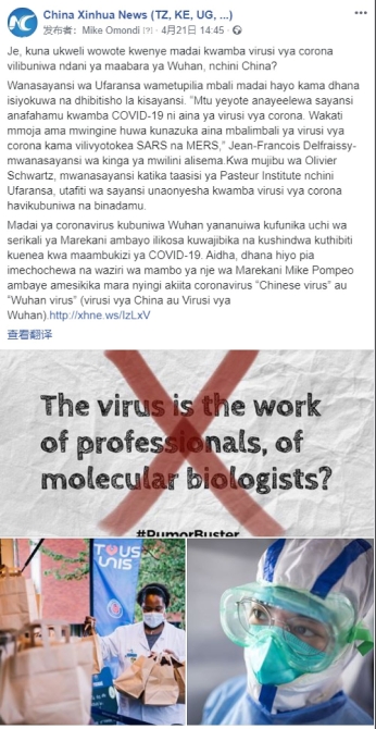 新華社斯瓦西里語臉譜報(bào)道:《新冠病毒源于實(shí)驗(yàn)室?不可信!》