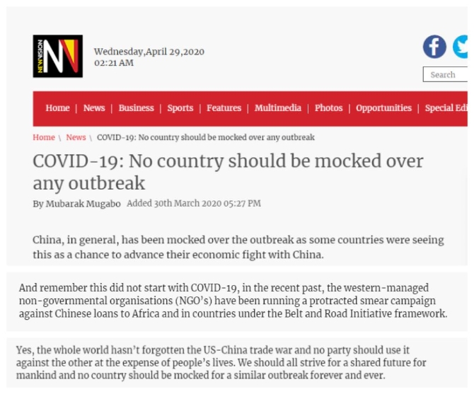 針對(duì)一些人在社交網(wǎng)絡(luò)上散布所謂“非洲人在廣州遭受歧視”等謠言、煽動(dòng)反華排華情緒,多國媒體接連發(fā)聲,駁斥不實(shí)傳言,拒絕對(duì)中國抗疫措施的歪曲抹黑。烏干達(dá)英文報(bào)紙《新視野》網(wǎng)站在文章《疫情之下,沒有國家應(yīng)當(dāng)被“嘲諷”》中指出,西方對(duì)中非關(guān)系的惡意并不始于新冠疫情,一段時(shí)間以來,西方圍繞“一帶一路”框架下所謂非洲債務(wù)陷阱問題展開抹黑運(yùn)動(dòng)。疫情當(dāng)前,我們應(yīng)當(dāng)為人類命運(yùn)共同體而努力,不能以生命為代價(jià)繼續(xù)做經(jīng)濟(jì)上的纏斗。