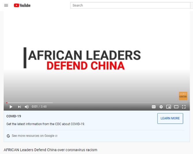 來自加納的自媒體Big Louis TV在優(yōu)兔平臺(tái)發(fā)布視頻:《在所謂疫情種族歧視問題上,非洲領(lǐng)導(dǎo)人捍衛(wèi)中國》。