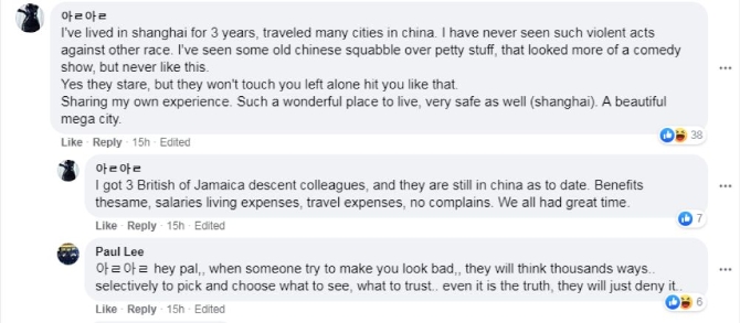 “我在上海生活了3年,去過中國許多城市。我從來沒見過這樣針對(duì)其他種族的暴力行為...是的,他們會(huì)盯著你看,但他們連碰都不會(huì)碰你,更別說像這樣打你了。分享我的親身經(jīng)驗(yàn):(上海)是個(gè)適合居住的地方,也非常安全。一個(gè)美麗的大城市?!?/p>