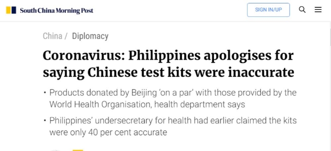《南華早報(bào)》網(wǎng)站:《菲律賓為稱中國試劑盒不準(zhǔn)確道歉》