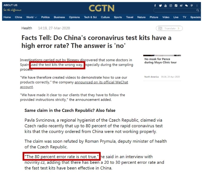 還有外媒炒作西班牙、捷克從中國采購的試劑盒“錯(cuò)誤率高”。但相應(yīng)政府機(jī)構(gòu)之后均澄清,之所以出現(xiàn)這種情況,是由于外方人員使用方法不當(dāng)造成。
