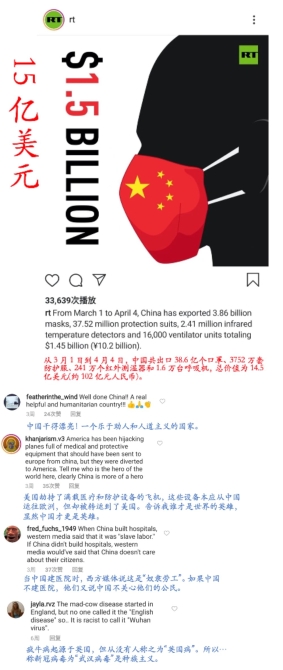 俄羅斯衛(wèi)星通訊社4月20日?qǐng)?bào)道,俄總統(tǒng)普京當(dāng)天表示,“2月份中國朋友有困難時(shí)我們發(fā)去了200萬只口罩。截至目前,從中國經(jīng)各種渠道進(jìn)入我國的口罩已達(dá)1.5億只?!苯袢斩砹_斯在照片墻(Instagram)上詳細(xì)列舉了從3月1日至4月4日中國向海外出口醫(yī)療物資的情況,獲得大批網(wǎng)友跟帖支持。