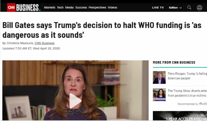 美國微軟公司創(chuàng)始人比爾·蓋茨在接受CNN采訪時(shí)批評(píng)特朗普暫停資助世衛(wèi)組織的做法非常“危險(xiǎn)”。他認(rèn)為世衛(wèi)組織干得“出色”,呼吁美國民眾支持世衛(wèi)組織的工作。