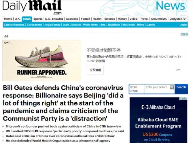 英國《每日郵報(bào)》大篇幅援引這則報(bào)道說,蓋茨認(rèn)為中國在疫情暴發(fā)初期“做了不少正確的事”,反而美國應(yīng)對(duì)疫情表現(xiàn)“糟糕”,批評(píng)中國只是為了轉(zhuǎn)移注意力。