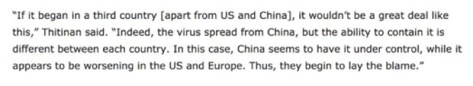 泰國主流媒體《及時(shí)新聞》引述泰國朱拉隆功大學(xué)國際問題專家提提南教授的話說,病毒在中國蔓延,但每個(gè)國家控制其蔓延的能力各有不同。中國似乎已經(jīng)控制住了,但歐美國家開始惡化,所以他們開始推卸責(zé)任了。
