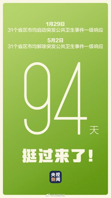 截至目前,31個?。ㄗ灾螀^(qū)、直轄市)和新疆生產(chǎn)建設(shè)兵團均解除一級響應(yīng)。