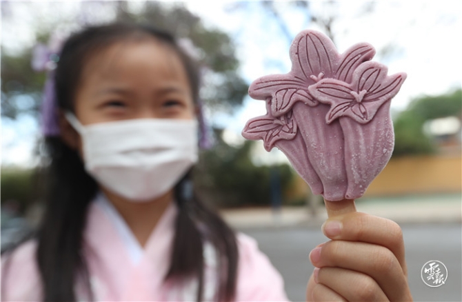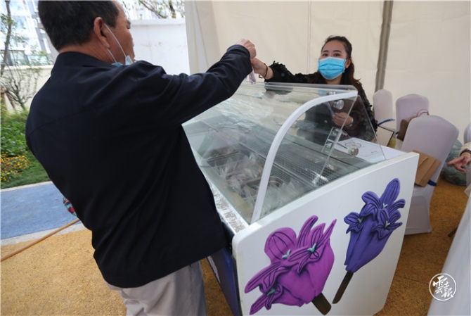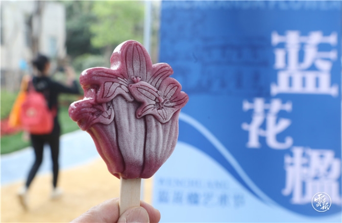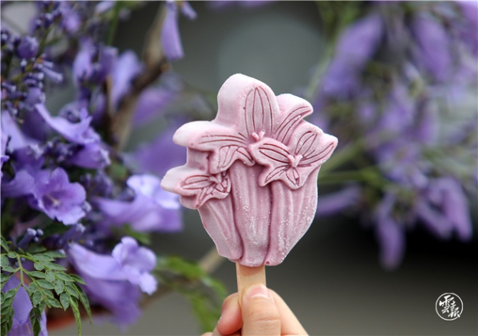據(jù)了解,在此次藍花楹藝術(shù)節(jié)上,由云南講武文化科技有限公司推出的文創(chuàng)藍花楹主題雪糕格外搶眼,美麗的花朵造型設(shè)計,顏色也是近乎藍花楹的色彩,還有3種不同口味(藍莓,牛奶,葡萄)的選擇,由于是純手工制作的雪糕,每天只能制作200余支,因此一上市就供不應求,非常受到市民的青睞。(云報客戶端記者:楊崢 攝影報道)