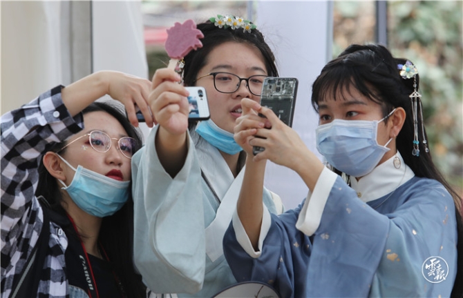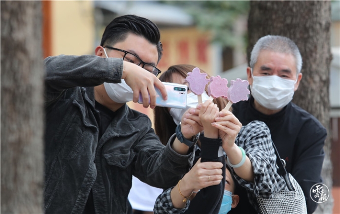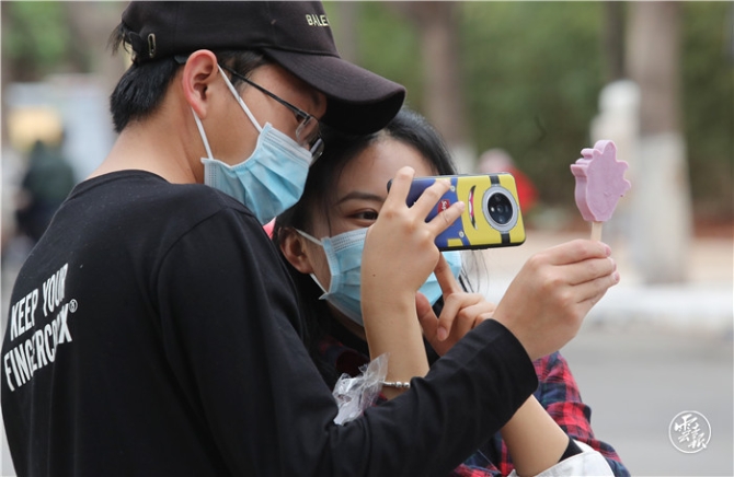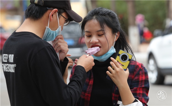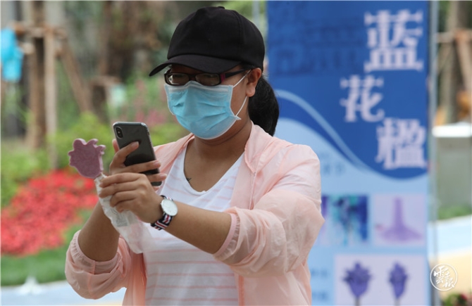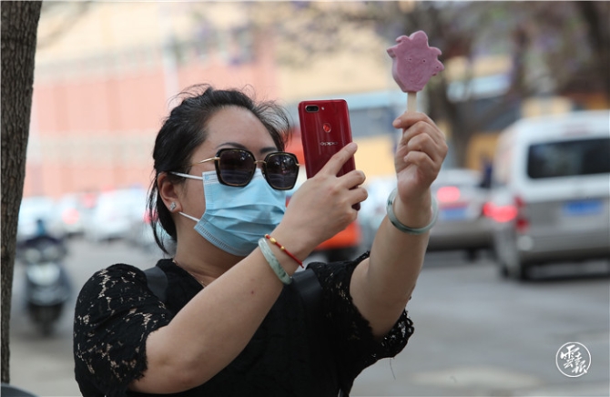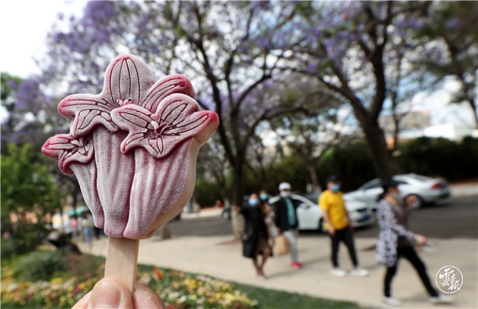 “五一”假日,在昆明教場中路藍花楹主題公園舉行的藍花楹藝術(shù)節(jié),首次上市的文創(chuàng)產(chǎn)品——藍花楹雪糕引得市民爭相購買,并作為特殊的道具拍照紀念。