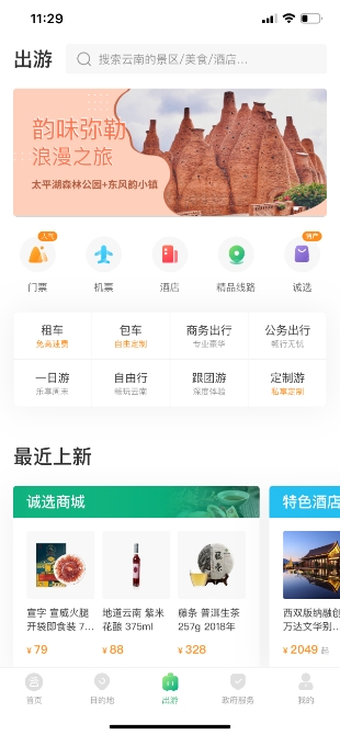 其中,“出游”模塊,按照“吃、住、行、游、購、娛”的旅游六要素,聚合OTA場景,并對(duì)3.0版中“服務(wù)、誠選”模塊的部分內(nèi)容進(jìn)行整合,使之更符合用戶的使用習(xí)慣。點(diǎn)擊進(jìn)入“出游”模塊,用戶就能更方便、快速地購買門票、機(jī)票、酒店、線路、特產(chǎn)、租包車出行、演出玩樂等旅游產(chǎn)品。