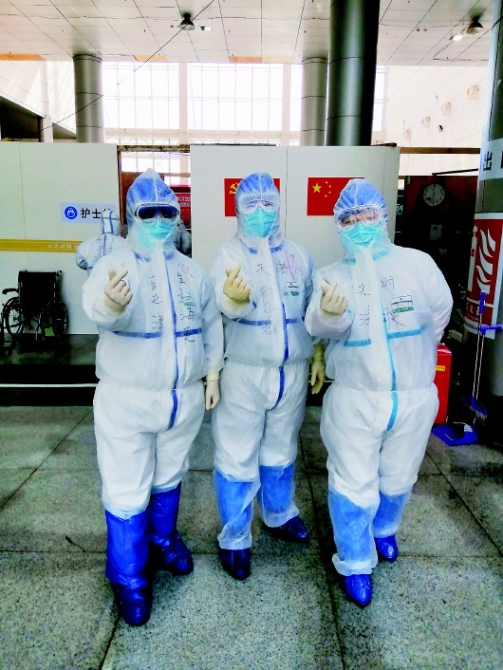 時(shí)秋(右一)與醫(yī)療隊(duì)隊(duì)員們穿戴好防護(hù)用品,成為了堅(jiān)守在武漢江岸方艙醫(yī)院“紅區(qū)”的白衣戰(zhàn)士。(2月18日攝,受訪者供圖)