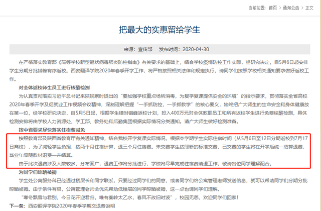 根據(jù)西安翻譯學(xué)院4月30日發(fā)布的通知顯示:根據(jù)本學(xué)期學(xué)生實(shí)際住宿時(shí)間(從5月6日至12日分期返校到7月17日離校),為了減輕學(xué)生負(fù)擔(dān),按兩個(gè)月住宿計(jì)算,退三個(gè)月住宿費(fèi)。