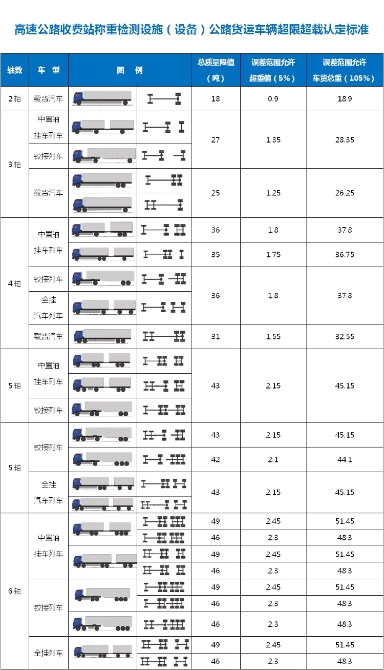 高速公路收費(fèi)站稱重檢測(cè)設(shè)施(設(shè)備)公路貨運(yùn)車輛超限超載認(rèn)定標(biāo)準(zhǔn),如下: