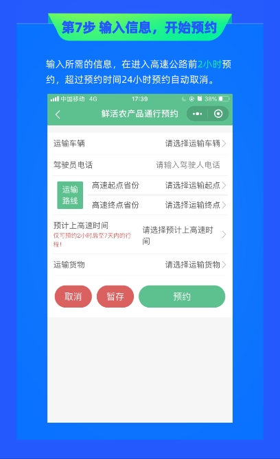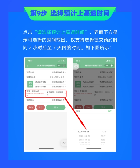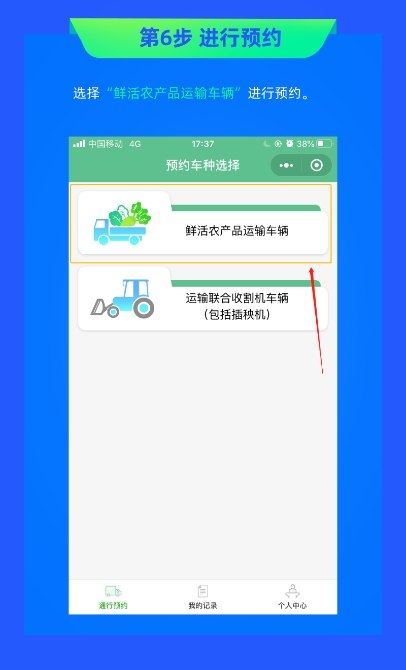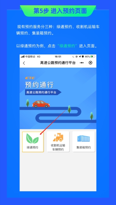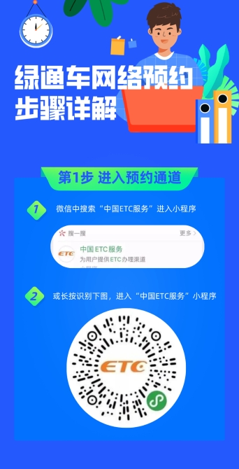 預(yù)約采用網(wǎng)絡(luò)預(yù)約形式,運(yùn)輸鮮活農(nóng)產(chǎn)品和聯(lián)合收割機(jī)的車輛可以在駛?cè)敫咚俟?小時(shí)前,通過“中國ETC服務(wù)小程序”進(jìn)行網(wǎng)絡(luò)預(yù)約。