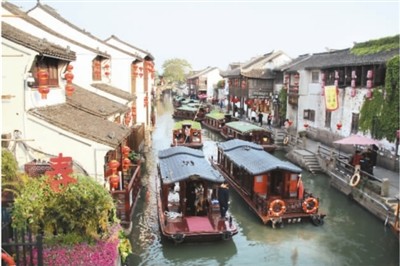 游客乘船游覽江蘇蘇州山塘古街。 王建康攝(人民圖片)