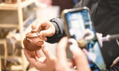 重慶市榮昌區(qū)旅游景區(qū)管委會(huì)舉辦的“云”游陶鎮(zhèn)網(wǎng)絡(luò)直播中,制陶手藝人向網(wǎng)友介紹陶藝作品和制陶技藝。 新華社 記者唐奕攝
