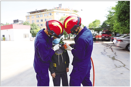 5月6日上午9時(shí)30分,文山丘北縣文秀路消防救援站全體指戰(zhàn)員正在進(jìn)行訓(xùn)練,突然接到指揮中心呼叫,一名教師帶著一名男孩到隊(duì)求助。