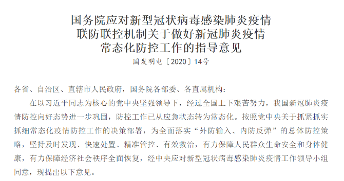 國務(wù)院印發(fā)應(yīng)對新型冠狀病毒感染肺炎疫情聯(lián)防聯(lián)控機制關(guān)于做好新冠肺炎疫情常態(tài)化防控工作的指導(dǎo)意見。指導(dǎo)意見提出,按照相關(guān)技術(shù)指南,在落實防控措施前提下,全面開放商場、超市、賓館、餐館等生活場所;采取預(yù)約、限流等方式,開放公園、旅游景點、運動場所,圖書館、博物館、美術(shù)館等室內(nèi)場館,以及影劇院、游藝廳等密閉式娛樂休閑場所,可舉辦各類必要的會議、會展活動等。