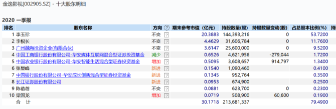 金逸影視方面,一季度,華安智能生活混合型證券投資基金加倉91.48萬股,華安成長創(chuàng)新混合型證券投資基金躋身前十大股東,持股95.28萬股。