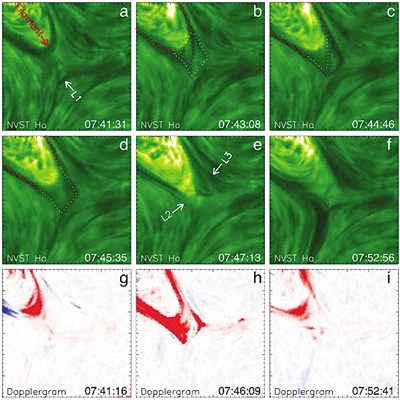 他們發(fā)現(xiàn),不同于經(jīng)典磁重聯(lián)中的相向運(yùn)動(dòng),暗條和磁環(huán)同時(shí)向同一個(gè)方向運(yùn)動(dòng),隨后它們之間發(fā)生磁重聯(lián)并且形成了一個(gè)典型的電流片,這種磁重聯(lián)被稱為不對(duì)稱磁重聯(lián),最后等離子體以旋轉(zhuǎn)噴流的形式被注入到新形成的磁環(huán)當(dāng)中。另外,從H-alpha多普勒?qǐng)D像上還觀測(cè)到在整個(gè)磁重聯(lián)過(guò)程當(dāng)中,磁重聯(lián)區(qū)的等離子體都表現(xiàn)為紅移特征,這可能與磁拓?fù)浣Y(jié)構(gòu)有關(guān)。