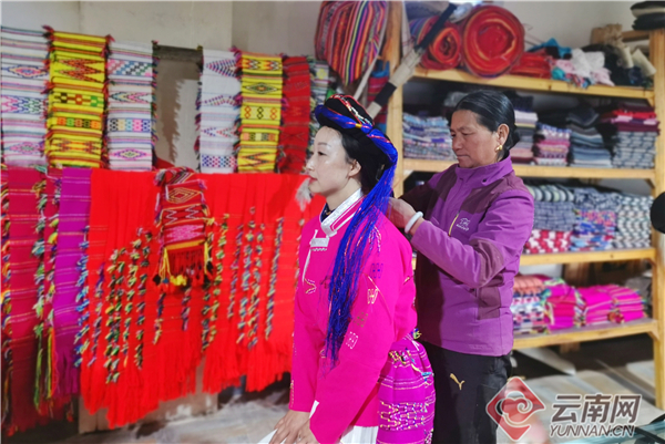 阿七獨支瑪為游客試穿摩梭人服飾 畢芃/攝