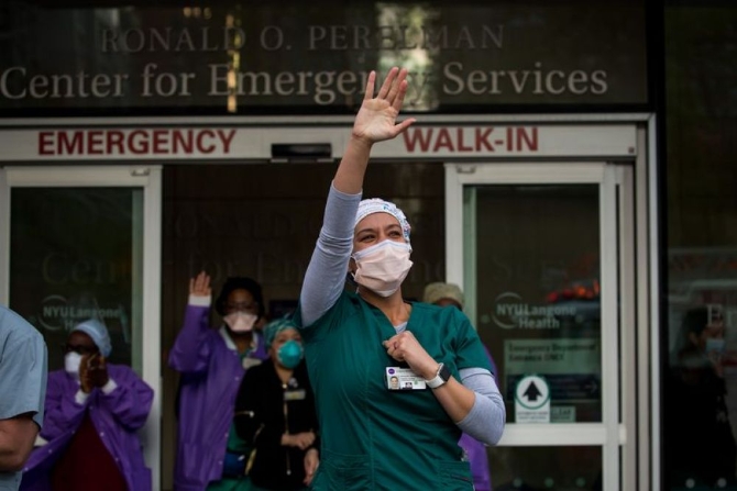 5月9日,在美國(guó)紐約一家醫(yī)院外,醫(yī)護(hù)人員向前來(lái)表示感謝的民眾揮手致意。(新華社發(fā),郭克攝)