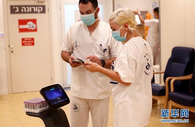 5月12日,在以色列特拉維夫市區(qū)附近的謝巴醫(yī)療中心新冠治療科室,醫(yī)護(hù)人員操作一臺智能服務(wù)型機(jī)器人。新華社發(fā)(吉爾科恩馬根 攝)