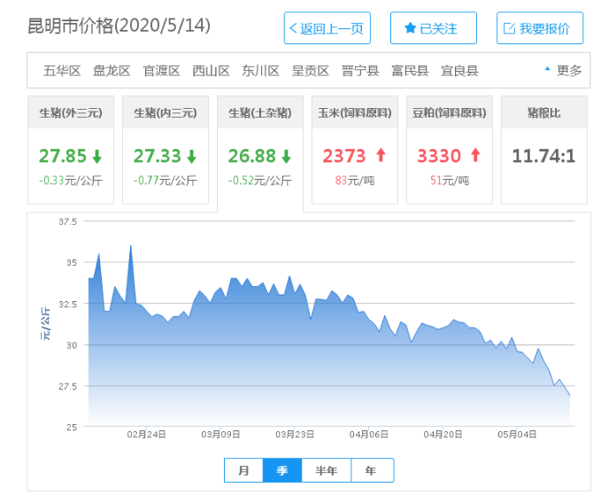 昆明市生豬屠宰交易量及價(jià)格監(jiān)測(cè)顯示,5月14日昆明生豬收購(gòu)平均價(jià)28.03元/公斤,白條豬價(jià)33.28元/公斤,與4月14日統(tǒng)計(jì)時(shí)相比,環(huán)比降幅分別為14.7%和17.5%。中國(guó)養(yǎng)豬網(wǎng)豬價(jià)系統(tǒng)監(jiān)測(cè)也顯示,5月14日昆明生豬(外三元)價(jià)為27.85元/公斤,生豬(內(nèi)三元)價(jià)為27.33元/公斤,生豬(土雜豬)價(jià)為26.88元/公斤,環(huán)比降幅分別為16.7%、15.8%和10.6%。