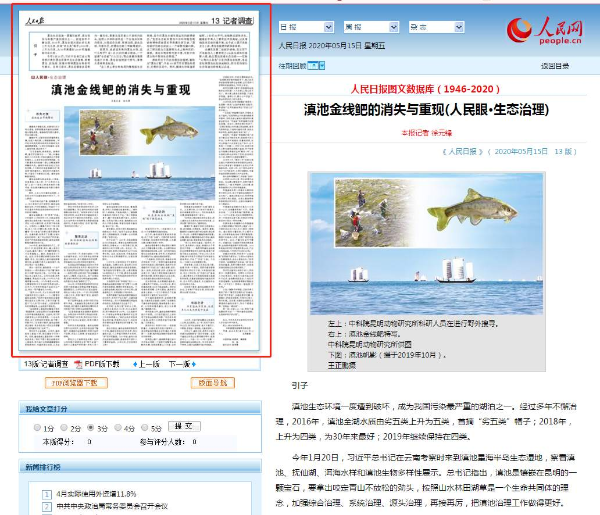 5月15日人民日?qǐng)?bào)記者調(diào)查版截圖,整版報(bào)道:《滇池金線鲃的消失與重現(xiàn)》。